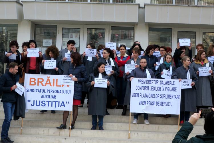 • vineri, în jur de 30 de grefieri din cadrul Judecătoriei şi Tribunalului Brăila s-au postat pe scările Palatului de Justiţie pentru a-şi arăta nemulţumirile • prin mesajele scrise pe pancarte, grefierii brăileni au tras un semnal de alarmă • la nivel naţional, circa 1.300 de persoane şi-au anunţat prezenţa la miting