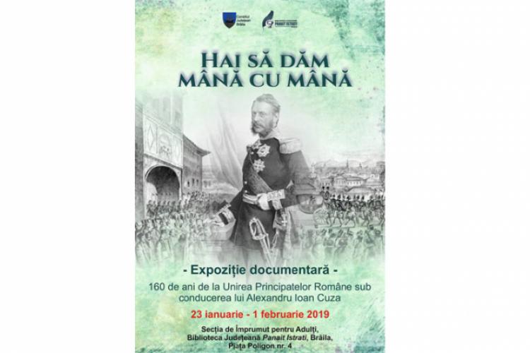 Biblioteca Judeţeană “Panait Istrati” Brăila marchează împlinirea a 160 de ani de la Unirea Principatelor Române prin organizarea unei expoziţii documentare intitulată “Hai să dăm mână cu mână”. Amplasată la parterul Secţiei Împrumut Adulţi, expoziţia poate fi vizitată până pe data de 1 februarie a.c.