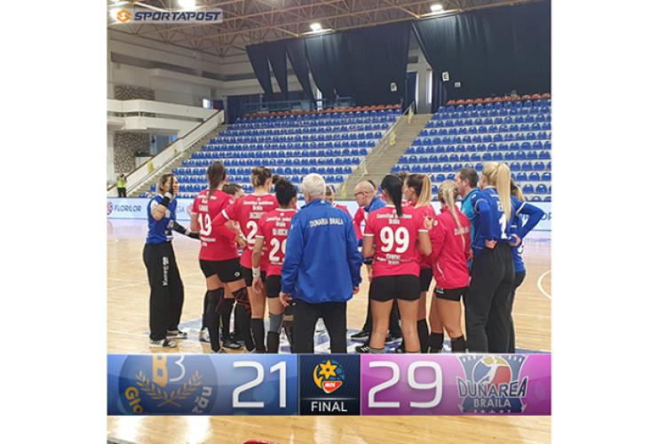 Partida a fost echilibrată până în minuutul 19, moment al jocului în care tabela a consemnat ultima egalitate, 8-8. Din acel moment formația brăileană a marcat de două ori prin Kurtovic și Rodrigues și s-a distanțat la două lungimi, 10-8. Pessoa a parat două aruncări de la 7 metri executate de Czeczi și Harabagiu, colegele din teren nu au mai irosit niciun atac iar HC Dunărea conducea cu 14-9 la pauză.