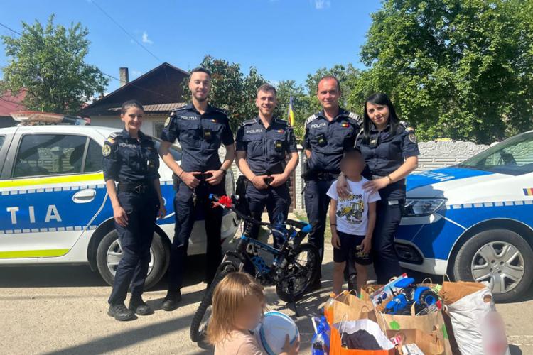 Iepurașul de Paști, în uniformă de poliţist, a ajuns cu daruri la o familie cu şapte copii din Șuțești