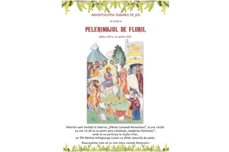 „Sâmbătă, 12 aprilie, în ajunul Praznicului Împărătesc al Floriilor, în municipiile Brăila și Galați, precum şi în alte localităţi din cele două judeţe ale Arhiepiscopiei Dunării de Jos, se va desfăşura tradiţionalul Pelerinaj de Florii, care aminteşte de momentul Intrării Mântuitorului nostru Iisus Hristos în cetatea Ierusalimului”, precizează Biroul de Presă al Arhiepiscopiei Dunării de Jos.