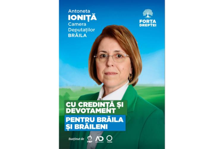 ”Candidez pentru un mandat de deputat, funcție pe care am mai deținut-o în perioada 2016-2020. Sunt medic și am performat în activitatea politică, fiind unul dintre cei mai eficienți membri din comisia pentru sănătate”, declară Antoneta Ioniță, liderul Forța Dreptei Brăila. Sursa citată susține că după terminarea mandatului, a continuat să monitorizeze cu atenție politicile propuse pentru sănătatea românilor: ”Am constatat că România a pierdut peste 700 de milioane de euro, bani din PNRR destinați investiției în unități spitalicești. Ca medic nu pot asista nepăsătoare la suferința oamenilor, la lipsa medicamentelor esențiale din farmacii și din spitale, la lipsa cadrelor medicale, la dificultatea cu care îți poți face o programare la investigații imagistice și de laborator, la accesibilitatea pacienților la consultațiile medicilor specialiști”.