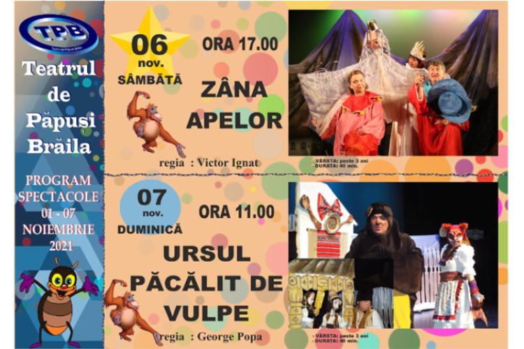 Weekendul acesta copiii sunt așteptați la Teatrul de Păpuși ”Cărăbuș”! Sâmbătă, de la ora 17.00, cei mici pot vedea spectacolul ”Zâna apelor”, regie, scenografie și muzică Victor Ignat. Piesa este adresată copiilor între 4 și 14 ani iar din distribuție fac parte actorii Valentina Lepădatu, Aurora Popescu și Iulian Gheorghe. În ziua următoare, duminică, 7 octombrie, de la ora 11.00, Teatrul de Păpuși ”Cărăbuș” îi invită pe pitici la spectacolul ”Ursul păcălit de vulpe”, adresat copiilor între 3 și 10 ani. Regia piesei este semnată de George Popa, scenografia de Clara Daranga Rasnoveanu, muzica de Ioan Popescu, iar din distribuție fac parte actorii Iulian Gheorghe, Daniela Antonescu, Aurora Popescu, Gabriela Picuș și Sofia-Gabriela Cătrună.