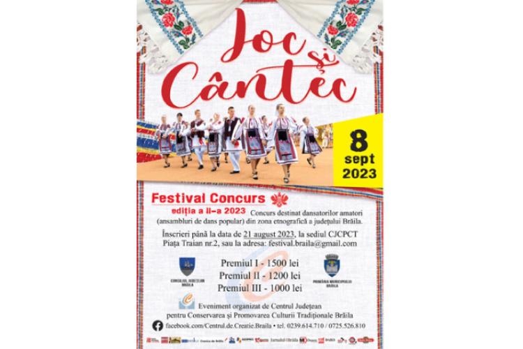 Consiliul Județean Brăila – prin Centrul Județean pentru Conservarea și Promovarea Culturii Tradiționale (Centrul de Creație) și Primăria Municipiului Brăila organizează, în septembrie 2023, cea de-a II-a ediție a Concursului județean pentru amatori „Joc și cântec”.