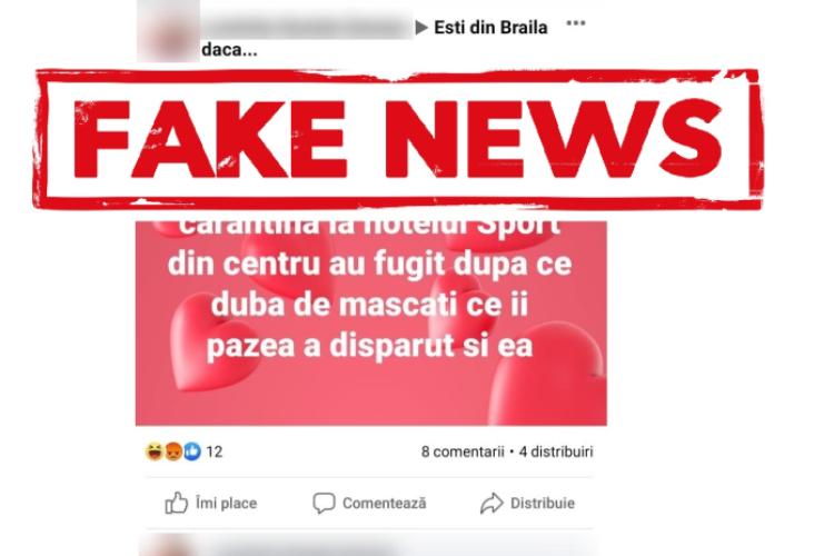 * autoritățile atrag atenția că cei care distribuie știri false ce sunt menite a induce panica în rândul populației riscă dosar penal * o astfel de informație falsă circulă pe grupurile de socializare cu membri brăileni, de câteva zile * Prefectura dezminte că ar fi existat persoane ce ar fi fugit dintr-un centru special de carantină