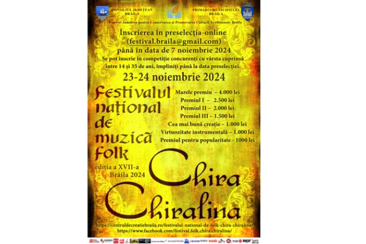 Consiliul Județean Brăila, prin Centrul Județean pentru Conservarea și Promovarea Culturii Tradiționale Brăila (Centrul de Creație) și Primăria Municipiului Brăila organizează, în perioada 23 – 24 noiembrie, cea de a XVII-a ediție a Festivalului Național de Folk „Chira Chiralina”.