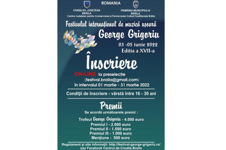 Consiliul Județean Brăila, Primăria Municipiului și Centrul Județean pentru Conservarea și Promovarea Culturii Tradiționale (Centrul de Creație) Brăila organizează în perioada 3-5 iunie cea de-a XVII-a Ediție a Festivalului Internațional de Muzică Ușoară ”George Grigoriu”.