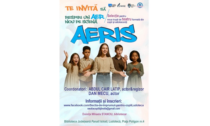 Biblioteca Județeană „Panait Istrati” Brăila, prin Secția pentru Copii. Ludotecă, lansează selecția pentru o nouă trupă de teatru pentru copii și adolescenți, „AERIS” – o provocare plină de energie și creativitate, desfășurată în colaborare cu actorul și regizorul Abdul Latip Cair.