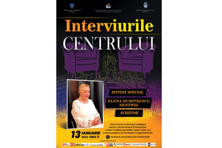 Astfel, Consiliul Județean Brăila, Primăria Municipiului și Centrul Județean pentru Conservarea și Promovarea Culturii Tradiționale (Centrul de Creație) Brăila organizează vineri, 13 ianuarie 2023, începând cu ora 11.00, evenimentul cultural „Interviurile Centrului” cu Elena Dumitrescu Nentwig. Născută la Brăila, Elena Dumitrescu Nentwig este unul dintre cei mai importanți și valoroși scriitori pe care îi avem, azi, în literatura română, personalitate marcantă a Diasporei, dar și o voce lirică cu recunoaștere internațională.