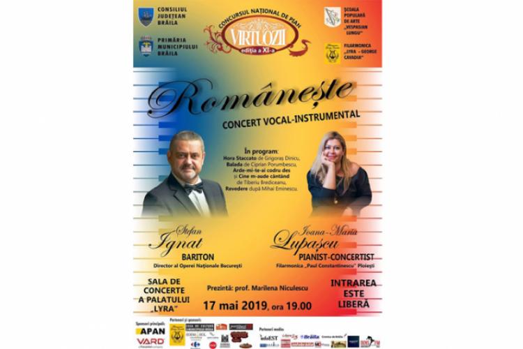 Vineri, 17 mai 2019, de la ora 19.00, la Sala de concerte a Palatului LYRA va avea loc concertul vocal-instrumental “Româneşte”, susţinut de Ioana Maria Lupaşcu, pianist-concertist la Filarmonica “Paul Constantinescu” din Ploieşti, şi de baritonul Ştefan Ignat, director al operei Naţionale Bucureşti. În program sunt lucrări ca: Hora Staccato, de Grigoraş Dinicu, Balada, de Ciprian Porumbescu, Cine m-aude cântând şi Arde-mi-te-ai codru des, de Tiberiu Brediceanu, Revedere, după Mihai Eminescu. Spectacolul va fi prezentat de profesor Marilena Niculescu, iar intrarea este liberă.