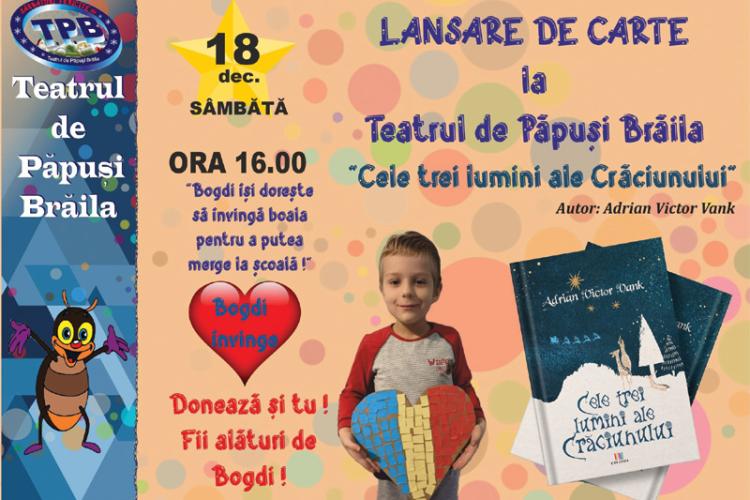 „Dragii noștri spectatori, vă așteptăm în acest weekend la Teatrul de Păpuși! Sâmbătă, 18 decembrie, ora 16.00, are loc lansarea volumului „Cele trei lumini ale Crăciunului”, scris de autorul brăilean Adrian Victor Vank și ilustrat de studenta Teodora Dobrea (Teo). Cartea a apărut la Editura Creator (Brașov), la începutul lunii decembrie 2021. După cum afirmă autorul, „cartea s-a scris aproape singură” și exprimă nevoia de poveste și magie existentă în fiecare dintre noi. Volumul conține povești cu tâlc potrivite pentru toate vârstele”, este îndemnul actorilor de la Teatrul de Păpuși adresat brăilenilor.Toți bănuții obținuți din vânzarea cărților se vor duce către proiectul umanitar BOGDI ÎNVINGE, în speranța că una dintre „Cele trei lumini ale Crăciunului” îl va face bine pe băiețelul care are doar 6 ani și multe planuri de viitor și care își dorește să meargă la școală, ca oricare alt copil.
