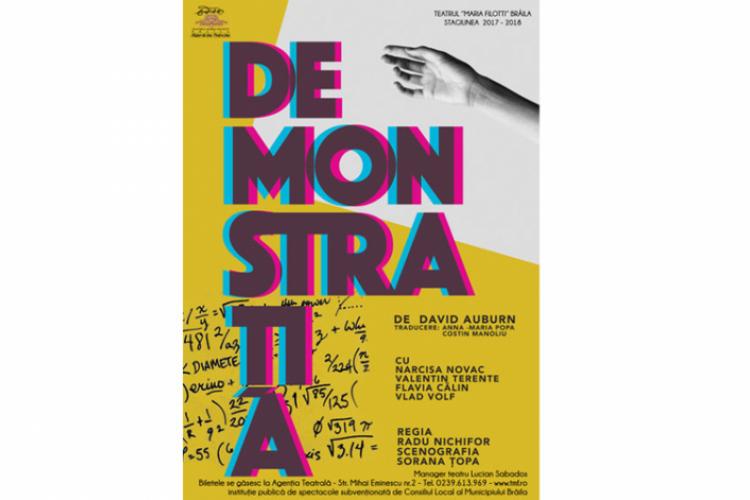 Piesă a scriitorului american contemporan David Auburn, DEMONSTRAŢIA este un spectacol montat în spaţiul Sălii Studio (Bujor Macrin), de regizorul Radu Nichifor, un text câştigător al Premiului Pulitzer în anul 2001, o piesă care a avut parte de un spectacol cu o mie de reprezentaţii pe Broadway, dar şi de o ecranizare, în 2005, cu o distribuţie de excepţie – Gwyneth Paltrow, Anthony Hopkins, Jake Gyllenhaal.