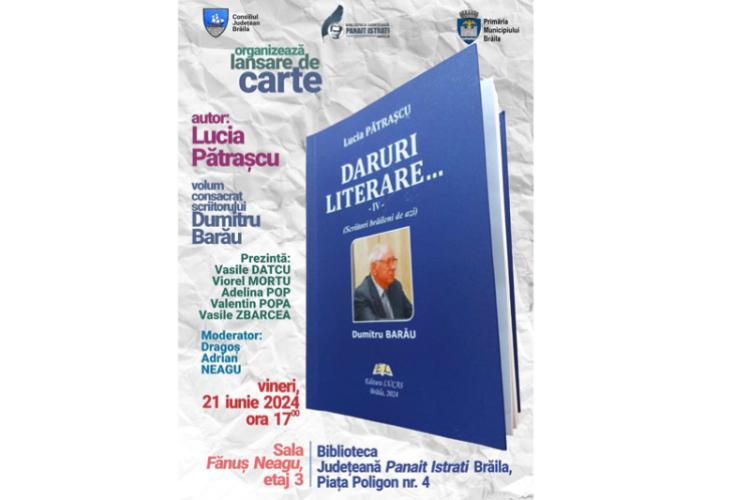 Biblioteca Județeană ”Panait Istrati” Brăila organizează astăzi, 21 iunie 2024, începând cu ora 17.00, o întâlnire literară specială. Este vorba despre lansarea cărții ”Daruri literare – IV – Scriitori brăileni de azi – Dumitru Barău” de Lucia Pătrașcu. Evenimentul are loc la Sala ”Fănuș Neagu” și va fi prezentat de Vasile Datcu, Viorel Mortu, Adelina Pop, Valentin Popa, Vasile Zbarcea. Moderează: Dragoș Adrian Neagu, directorul bibliotecii.