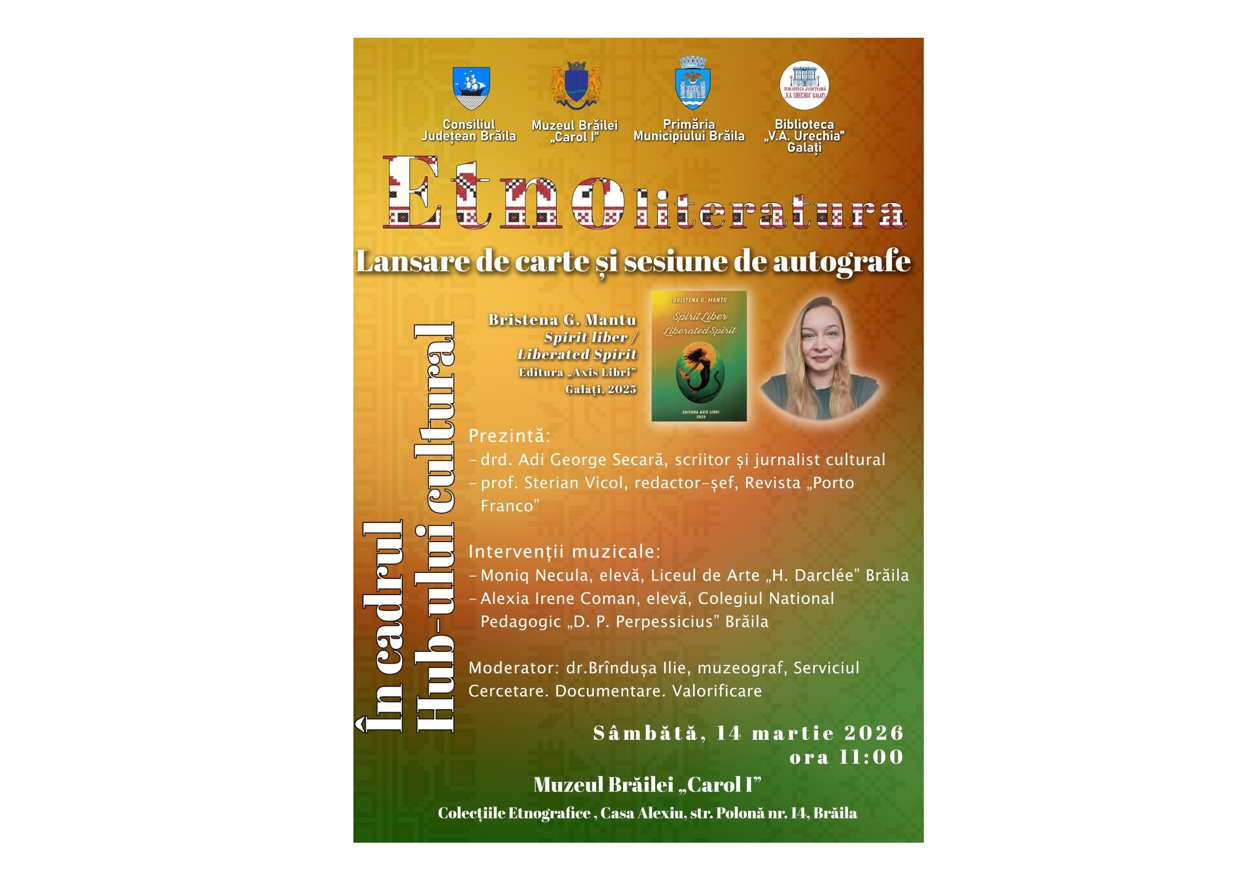 Muzeul Brăilei „Carol I” – Casa Colecțiilor Etnografice, alături de Biblioteca Județeană „V. A. Urechia” Galați invită publicul brăilean în ziua de sâmbătă, 14 martie 2026, începând cu ora 11:00, la lansarea cărții „Spirit liber/Liberated Spirit” (autor Bristena G. Mantu), volum publicat la Editura „Axis Libri”, din municipiul Galați, în anul 2025. Evenimentul va avea loc în cadrul Hub-ului cultural „Etnoliteratura”, la Casa Alexiu, sediul Colecțiilor Etnografice, din Strada Polonă nr. 14, monument istoric.