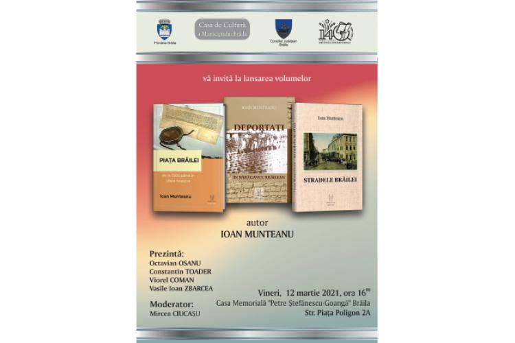 Vineri, 12 martie, de la ora 16.00, la Casa de Cultură a Municipiului Brăila va avea loc lansarea volumelor “Piața Brăilei de la 1300 până în zilele noastre”, “Deportați în Bărăganul Brăilean” și “Stradele Brăilei”, semnate de profesor Ioan Munteanu.