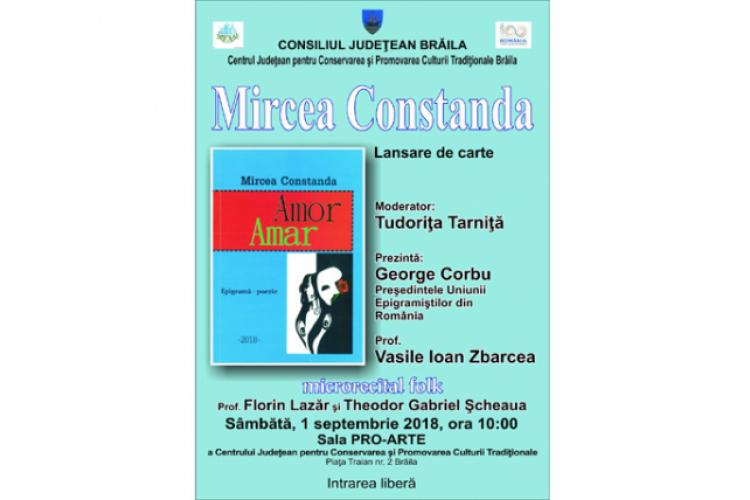 Sâmbătă, 1 septembrie 2018, ora 10.00, la Sala PRO-ARTE a Centrului de Creaţie Brăila, din Piaţa Traian nr. 2, va avea loc lansarea volumului de epigramă şi poezie “AMOR AMAR”, semnat de avocatul Mircea Constanda.