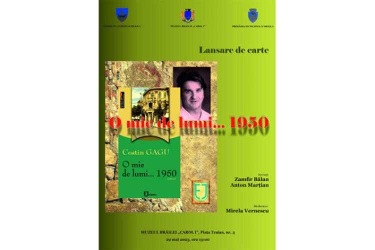Muzeul Brăilei „Carol I” îi invită pe brăileni luni, 29 mai 2023, de la ora 13.00, la sediul central din Piața Traian nr. 3 (Sala „Regele Ferdinand I și Regina Maria”), la lansarea cărții „O mie de lumi…1950”, autor Costin Gagu. Cartea a apărut, anul acesta, la Editura Junimea din Iași și a fost lansată, prima dată, la cea de-a XVI-a ediție a Salonului Internațional de Carte „Bookfest 2023”, care se desfășoară, zilele acestea, la București (Pavilionul B2 Romexpo), la standul Editurii Junimea.