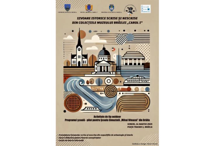 Vineri, 14 martie, începând cu ora 9:30, Muzeul Brăilei „Carol I”, în parteneriat cu Școala Gimnazială „Mihai Viteazul” Brăila organizează, la sediul central din Piața Traian nr. 3, o activitate de tip outdoor din Programul școală – pilot pentru instituțiile de învățământ din Brăila. Tema activității este: „Izvoare scrise și nescrise din colecțiile Muzeului Brăilei” și include un tur ghidat în expozițiile permanente de arheologie și istorie, jocuri didactice pentru fixarea cunoștințelor și o lecție de istorie informală.