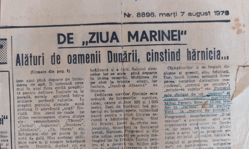 De mai bine de șase decenii, Mihai Feraru, omul care a învățat marinăria de la părinții săi și pe care apusul vieții l-a prins pe Dunăre, spintecând valurile cu nava „Lacu Sărat”, a fost și a rămas un învingător. A străbătut toată Europa pe fluviu, de la Sulina și până la Regensburg, în Germania Federală, a câștigat „porcul la școndru” de mai bine de 20 de ori, încă de pe vremea lui Dej, și a trăit momentul decembrie 1989, împreună cu familia, pe „Severnav”, în Portul Brăilei, sub ploaia de gloanțe care au făcut ciur structura navei pe care se adăposteau și care le era și casă. N-ai să vezi un om mai optimist și mai plin de umor ca Mihai Feraru, marinarul albit de ani, care zâmbește chiar și atunci când povestește cum era să fie răpus de gloanțe când a picat regimul comunist. Și măcar dacă ar fi avut și dumnealui un „certificat de revoluționar”!…
