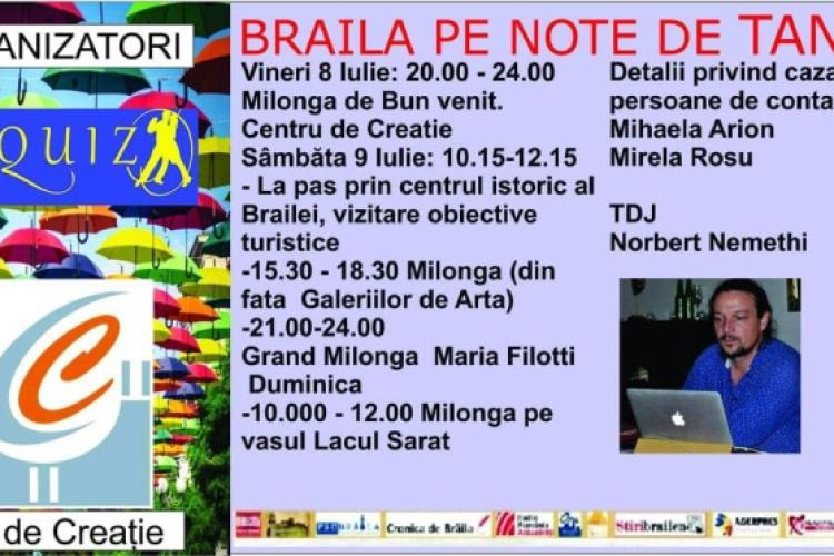 Potrivit comunicatului trimis de Centrul de Creație, frumusețea verii se va îmbina cu frumusețea dansului într-un maraton de tango organizat de către Consiliul Județean Brăila prin Centrul Județean pentru Conservarea și Promovarea Culturii Tradiționale Brăila, Primăria Municipiului Brăila, prin Teatrul „Maria Filotti”, și Școala de dans „Urquiza”, în perioada 8-10 iulie 2022.