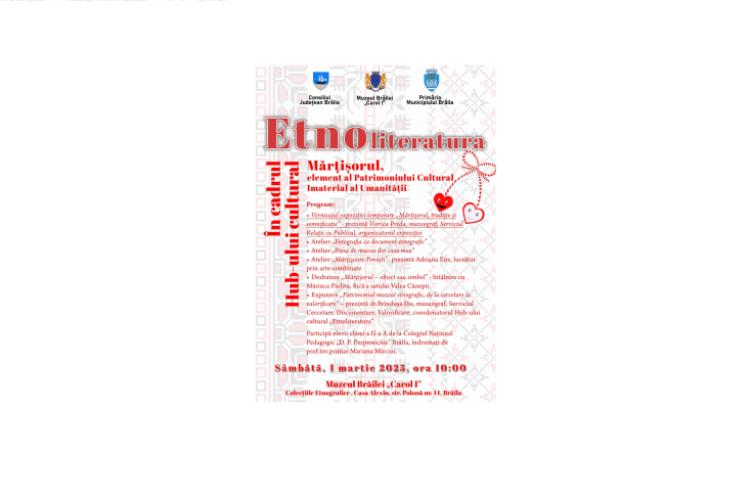 Muzeul Brăilei „Carol I” – Colecțiile Etnografice organizează sâmbătă, 1 martie, de la ora 10:00, o nouă întâlnire în cadrul Hub-ului cultural „Etnoliteratura”. Evenimentul va fi organizat la Casa Alexiu – monument istoric de arhitectură din Strada Polonă nr. 14 – și va avea ca temă „Mărțișorul, element al Patrimoniului Cultural Imaterial al Umanității”.