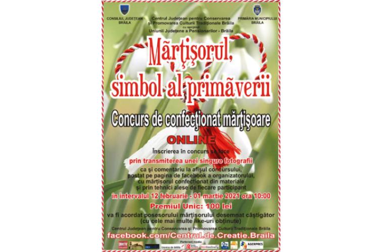 Centrul Județean pentru Conservarea și Promovarea Culturii Tradiționale (Centrul de Creație) Brăila, cu sprijinul Uniunii Județene a Pensionarilor, Consiliului Județean și Primăriei Municipiului Brăila organizează, zilele acestea, concursul online de confecționat mărțișoare intitulat „Mărțișorul, simbol al primăverii”.