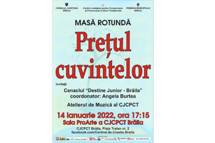 Consiliul Județean Brăila, Primăria Municipiului și Centrul Județean pentru Conservarea și Promovarea Culturii Tradiționale (Centrul de Creație) Brăila organizează, în după-amiaza zilei de 14 ianuarie 2022, ora 17.15, evenimentul cultural Masă rotundă – „Prețul cuvintelor”.