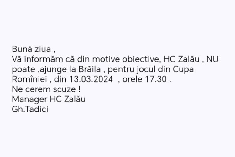 Cu părere de rău vă anunțăm că meciul de astăzi contând pentru Turul 3 – Cupa României nu se va disputa din cauza neprezentării echipei adverse. În această dimineață am primit informare din partea clubului HC Zalău invocând motive ”obiective” că nu se va prezenta la meci.