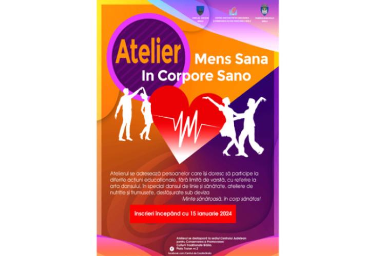 „Atelierul „Mens sana in corpore sano” este un proiect ce se adresează persoanelor care își doresc să participe la diferite acțiuni culturale, cu referire la arta dansului, în special dansul de linie și sănătate (în special ateliere de nutriție și frumusețe), desfășurate sub deviza „Minte sănătoasă, în corp sănătos”. Prin intermediul acestui atelier se urmărește: dezvoltarea personală, indiferent de vârstă; creșterea capacității de adaptare, de comunicare și de relaționare a persoanelor de diferite vârste; descoperirea, cultivarea și fructificarea propriilor abilități și talente artistice, nedescoperite până acum; respectul față de sine, prin acordarea unei atenții sporite sănătății personale și a celor dragi”, precizează organizatorii atelierului.