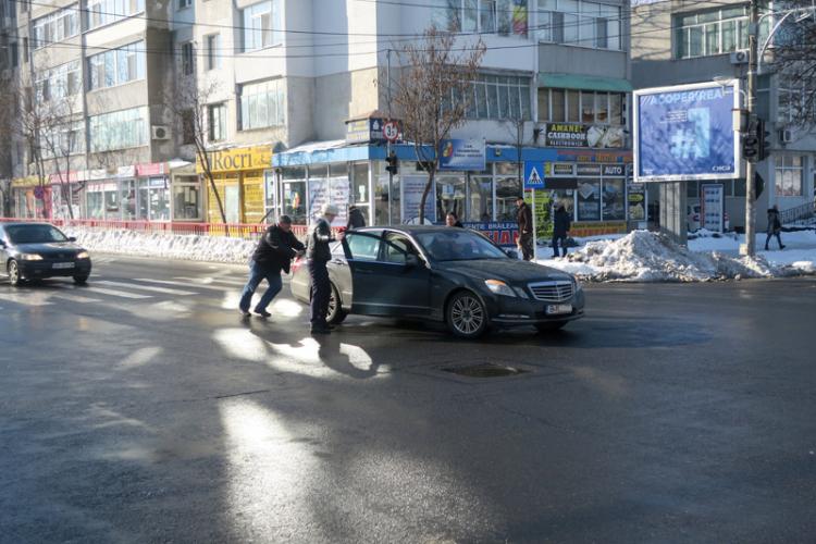 Incident miercuri dimineață, în jurul orei 10.30, când un autoturism Mercedes a rămas în pană chiar în mijlocul intersecției străzii 1 Decembrie 1918 cu strada Griviței, la Piața Mare, într-o poziție care încurca serios traficul. Prima reacție a multor șoferi a fost, evident, să claxoneze și probabil să înjure obstacolul neașteptat pe care trebuia să-l ocolească fiecare cum se pricepea mai bine. Nu se poate spune că a apărut un blocaj propriu-zis în trafic, dar mașina oprită în mijlocul intersecției încurca serios circulația. După ce a devenit evident că există o problemă și că Mercedesul la volanul căruia se afla o femeie nu se poate mișca din loc, doi bărbați au încercat să îl împingă, însă au constatat că mașina are cutie automată, iar roțile erau blocate. O mașină de Poliție care trecea întâmplător prin zonă a tras pe dreapta, iar agenții au mers să vadă ce se întâmplă. Unul dintre ei s-a urcat la volanul Mercedesului, în locul doamnei care efectiv nu știa ce să facă pentru a porni motorul. Polițistul a încercat și el să dea o cheie, dar fără succes. Între timp, a trecut pe acolo și o mașină a unei firme private de pază, care de asemenea a oprit, iar unul dintre agenți a încercat la rândul său să pornească Mercedesul blocat, dar tot degeaba. Circulația din intersecție se desfășura în continuare cu dificultate. Claxoanele sunau, nervozitatea unora dintre șoferi era evidentă. Te-ai fi așteptat ca echipajul de Poliție să rămână la fața locului, pentru a ajuta cumva la fluidizarea traficului până la mutarea mașinii stricate din intersecție și pentru a detensiona situația dacă vreun participant la trafic și-ar fi vărsat nervii pe femeia rămasă cu mașina în drum. Că sloganul Poliției Române este ”Siguranță și încredere”! Surprinzător, însă, agenții îmbrăcați în uniforma statului s-au urcat în mașina de Poliție și au plecat. Or fi avut vreo misiune mai importantă în desfășurare, n-avem de unde să știm… Din fericire pentru ghinionista șoferiță, agenții de la firma privată de pază s-au dovedit a fi mult mai săritori. Aceștia și-au chemat colegii în ajutor, iar o altă mașină a aceleiași firme a oprit în fața Mercedesului – evident spre nemulțumirea unor șoferi care vociferau că li s-a blocat calea – a conectat cablurile speciale la baterie, iar problema s-a rezolvat. Mercedesul a pornit și intersecția a fost deblocată. ”Am oprit ca să ajut! Nu trebuie să fim oameni?!”, i-a răspuns agentul firmei de pază unui trecător care l-a întrebat dacă o cunoștea dinainte pe doamna de la volanul mașinii stricate sau a oprit pur și simplu când a văzut mașina blocată în intersecție. La rândul său, șoferița i-a spus unui martor că schimbase bateria autoturismului recent, cu o zi sau două, și că nu își explică ce s-a întâmplat. Între timp, la fața locului a apărut și o persoană cu o baterie nouă, probabil un reprezentant al firmei de la care fusese cumpărată cea defectă.