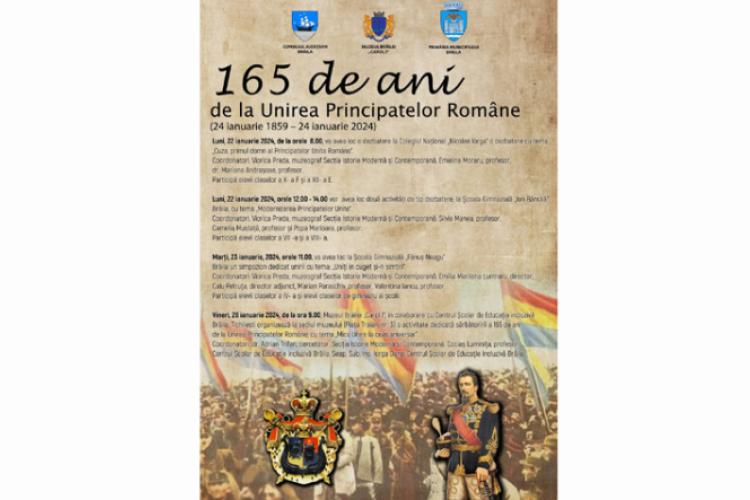 În fine, vineri, 26 ianuarie 2024, de la ora 9.00, Muzeul Brăilei „Carol I”, în colaborare cu Centrul Școlar de Educație Incluzivă Brăila – Tichilești organizează la sediul muzeului (Piața Traian, nr. 3) o activitate dedicată sărbătoririi a 165 de ani de la Unirea Principatelor Române, cu tema „Mica Unire la ceas aniversar”. Coordonatori: dr. Adrian Trifan, cercetător, Secția Istorie Modernă și Contemporană a Muzeului Brăilei „Carol I”, prof. Luminița Cociaș și subinsp. Oana Iorga, Centrul Școlar de Educație Incluzivă Brăila.