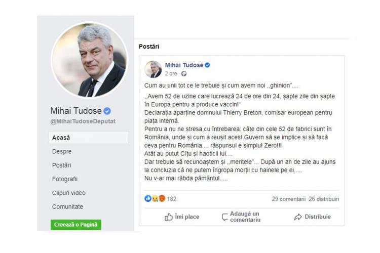 Tudose a pornit de la o declarație recentă a comisarului european Thierry Breton, care a anunțat că există 52 de fabrici în statele europene ce produc deja vaccinuri împotriva COVID-19. Europarlamentarul a criticat lipsa de implicare a Guvernului Florin Cîțu în a încuraja și a sprijini producerea de vaccinuri și la nivelul României. Acesta chiar a dorit să sublinieze că țara noastră produce ”ZERO” vaccinuri anti-COVID.