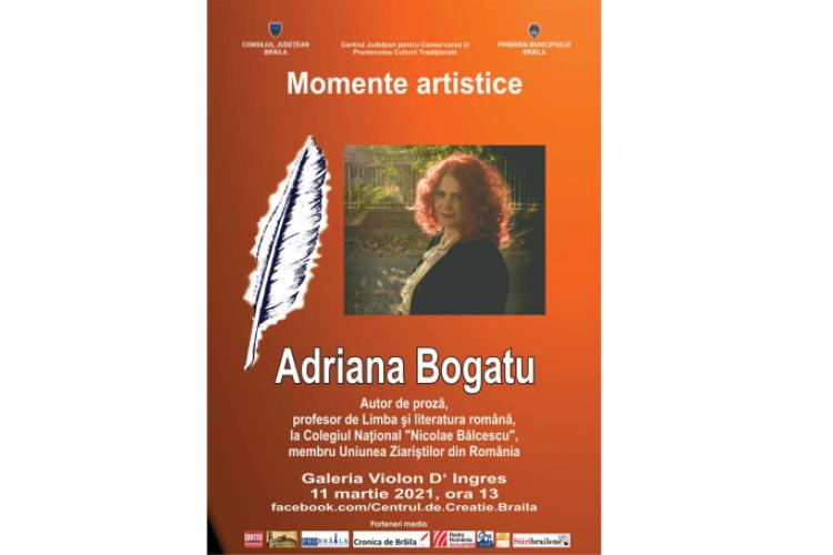 Centrul Județean pentru Conservarea și Promovarea Culturii Tradiționale Brăila are ca invitat special, în data de 11 martie, la Momentul artistic de la ora 13.00, pe Adriana Bogatu, autor de cronici teatrale și proză, profesor de Limba și literatura română la Colegiul Național Nicolae Bălcescu, membru al Uniunii Ziariștilor din România.