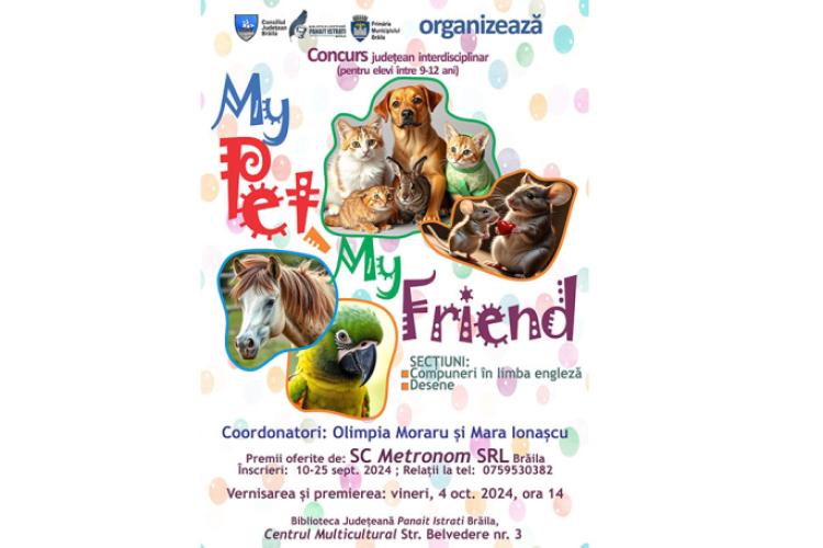 Copiii brăileni din municipiu și județ sunt invitați să-și arate talentul la literatură și desen participând la concursul „My Pet, My Friend”, organizat de Biblioteca Județeană „Panait Istrati” Brăila, la Centrul Multicultural, cu prilejul Zilei Internaționale a Animalelor, zi sărbătorită pe data de 4 octombrie a fiecărui an.