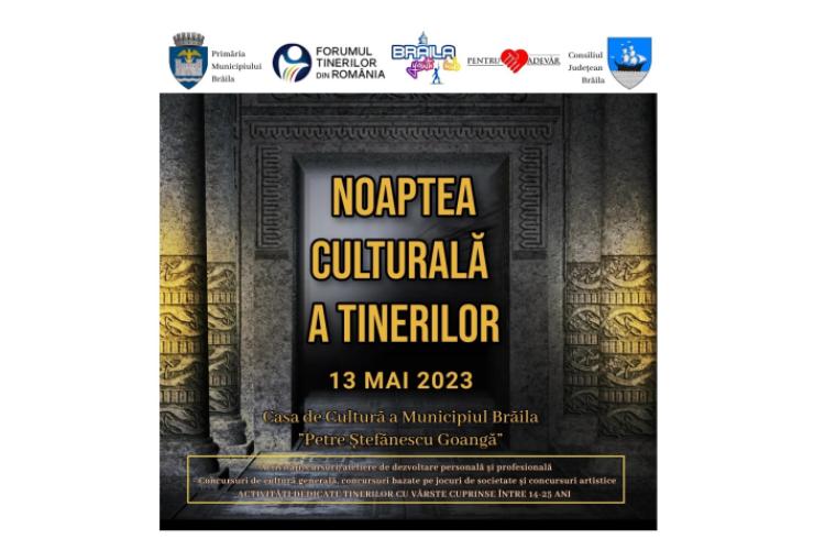 De ”Noaptea Muzeelor”, Forumul Tinerilor din România – Brăila și Centrul de Tineret – Brăila Youth Hub organizează un eveniment dedicat tinerilor. Vorbim mai exact despre ”Noaptea Culturală a Tinerilor”, care va avea loc sâmbătă, 13 mai, la Casa de Cultură a Municipiului Brăila ”Petre Ștefănescu Goangă”.