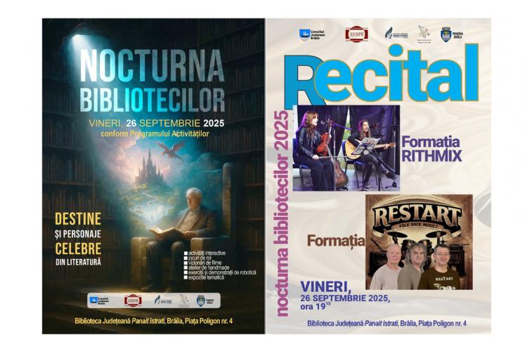 La Brăila, Nocturna Bibliotecilor se desfășoară vineri, 26 septembrie, începând cu ora 17.00, la sediul Bibliotecii Județene „Panait Istrati”. Brăilenii de toate vârstele vor putea participa la următoarele activități: