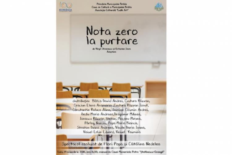 Luni, 19 noiembrie, de la ora 18.00, în mansarda Casei Memoriale “Petre Ştefănescu-Goangă”, va avea loc spectacolul “Nota zero la purtare”, de Virgil Stoenescu şi Octavian Sava. O piesă de teatru extraordinară, un spectacol plin de emoţie, pus în scenă de tinerii Cercului de teatru al Casei de Cultură, sub bagheta regizorală a actriţelor Flori Popa şi Cătălina Nedelea.