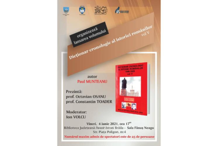 Biblioteca Județeană ”Panait Istrati” Brăila vă invită vineri, 4 iunie 2021, ora 17.00, la lansarea cărții ”Dicționar cronologic al istoriei românilor 1948 – 1989”, volumul 5, semnat de prof. Paul Munteanu. Lucrarea prezintă istoria succintă a comunismului din România care a dăinuit peste 40 de ani, plecând de la perioada dejistă, continuând cu epoca ceaușistă, până la căderea regimului politic.