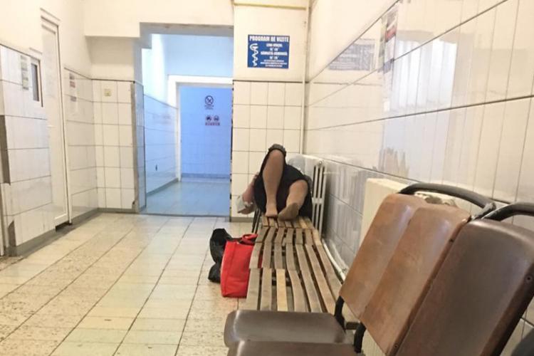 Pacientă în suferință, lăsată să aștepte o oră, întinsă pe o canapea din holul Spitalului 3