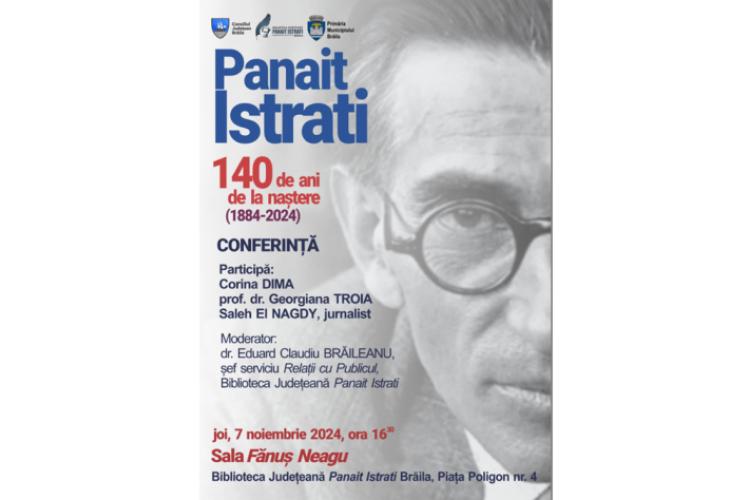 Astfel, Biblioteca Județeană „Panait Istrati” Brăila îi invită pe brăilenii de toate vârstele joi, 7 noiembrie, începând cu ora 16:30, la Conferința „Panait Istrati – 140 de ani de la naștere”. Evenimentul va avea loc în Sala „Fănuș Neagu”, de la etajul 3 al instituției din Piața Poligon.