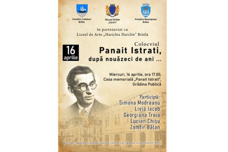 Muzeul Brăilei „Carol I”, Consiliul Județean și Primăria Municipiului Brăila, în parteneriat cu Liceul de Arte „Harclea Darclee”, organizează miercuri, 16 aprilie, începând cu ora 17:00, colocviul „Panait Istrati, după nouăzeci de ani…”. Evenimentul cultural dedicat marelui scriitor va avea loc la Casa Memorială „Panait Istrati”, din Grădina Publică, aparținând Muzeului Brăilei „Carol I”. Vor susține alocuțiuni și vor evoca personalitatea și opera lui Panait Istrati: Simona Modreanu, Livia Iacob, Georgiana Troia, Lucian Chișu și Zamfir Bălan. Evenimentul de miercuri, de la Casa Memorială „Panait Istrati” este organizat cu sprijinul Centrului Cultural și de Agrement „Chira Chiralina” Brăila, coordonat de Emanoil Ciucașu.
