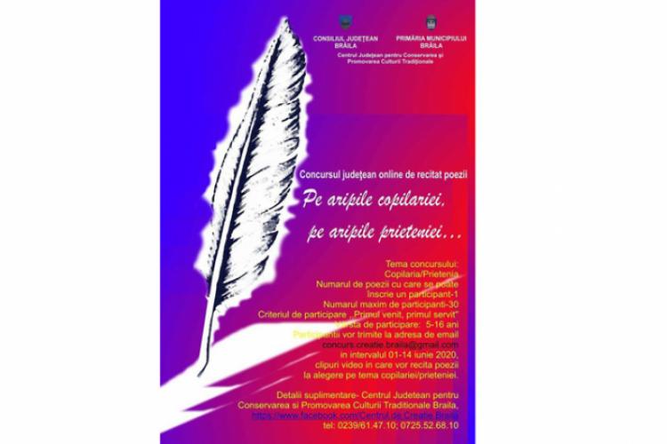 Consiliul Judeţean Brăila, Primăria Municipiului Brăila, Centrul Judeţean pentru Conservarea şi Promovarea Culturii Tradiţionale Brăila organizează Concursul judeţean online de recitat poezii “Pe aripile copilăriei, pe aripile prieteniei… “