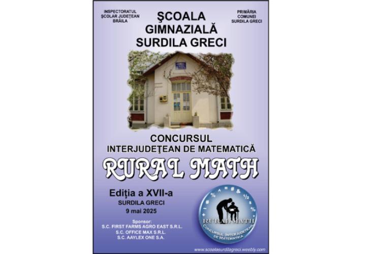 • în Surdila Greci, o comună brăileană cu mai puțin de 1.600 de locuitori, unde performanța educațională s-a transformat în tradiție, concursul de matematică Rural Math a ajuns la ediția a XVII-a și aduce an de an împreună elevi, profesori și susținători ai educației rurale • la ediția din acest an și-au anunțat participarea un număr de 188 de elevi din ciclul gimnazial, provenind din 26 de școli din mediul rural (16 școli din județul Brăila, șase din Buzău, trei din Ialomița și una din Prahova), care pe data de 9 mai vor avea posibilitatea să își testeze cunoștințele într-un cadru competitiv, dar prietenos
