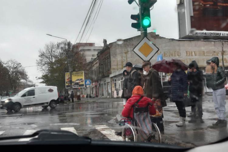 Pericol în stradă. Cerșetor în scaun cu rotile, printre mașini și prin ploaie, în zona Piața Mare