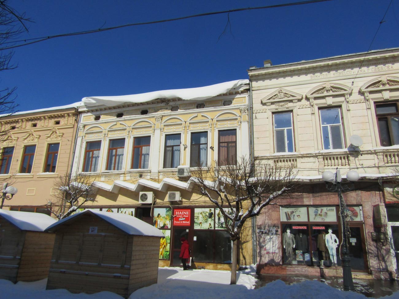 • în special pe strada Mihai Eminescu, pe acoperișurile în pantă ale clădirilor atârnă fuioare de zăpadă care oricând se pot prăvăli peste pietoni • cu toate acestea, zonele periculoase nu sunt nici măcar marcate, doar în dreptul Teatrului ”Maria Filotti” existând, ieri, benzi de avertizare