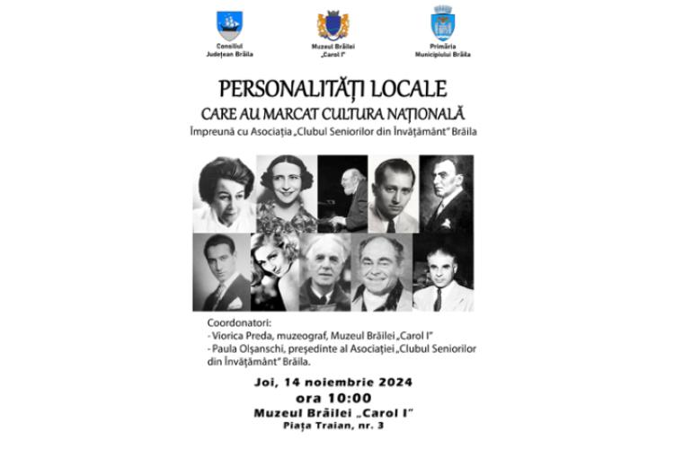 Astfel, joi, 14 noiembrie, de la ora 10:00, în Sala „Regele Ferdinand I și Regina Maria” a Muzeul Brăilei „Carol I”, are loc evenimentul „Personalități locale care au marcat cultura națională”, organizat de instituția gazdă în colaborare cu Asociația „Clubul Seniorilor din Învățământ” Brăila.