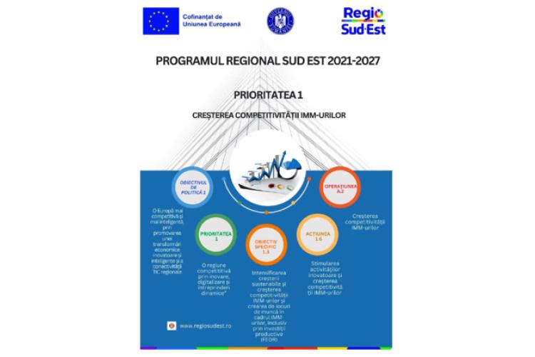 Agenția pentru Dezvoltare Regională Sud-Est, în calitate de Autoritate de Management pentru Programul Regional Sud-Est 2021-2027, anunță lansarea apelului de proiecte dedicat IMM-urilor în cadrul Priorității 1 “O regiune competititivă prin inovare, digitalizare și întreprinderi dinamice”, Acțiunea 1.6 ”Stimularea activităților inovatoare și creșterea competitivității IMM-urilor”. Această acțiune vizează creșterea competitivității IMM-urilor și crearea de locuri de muncă în cadrul acestora prin inovare, digitalizare și dezvoltarea de întreprinderi dinamice, în vederea unei îmbunătățiri semnificative a capacității tehnologice, industriale și organizaționale de a gestiona dezvoltarea de produse și servicii.