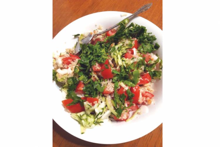 Într-o tigaie se pun ceapa și morcovul cu puțină apă, se fierb la foc mic cu capac, se pun pe rând ciupercile, ardeiul, dovlecelul, quinoa fiartă și la sfârșit condimentele și roșiile uscate tocate mărunt. După ce s-a oprit focul și s-a mai răcit puțin se adaugă pătrunjelul și uleiul de măsline.