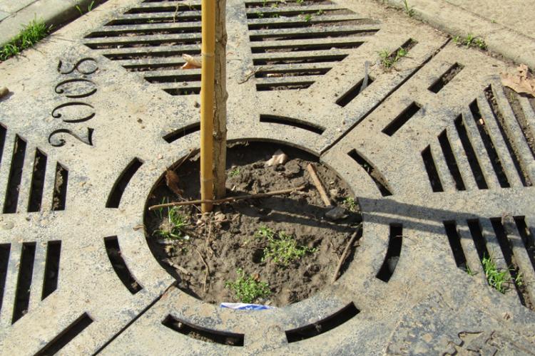 • nu toți puieții de salcâm puși recent în locul celor care au trebuit înlocuiți pentru că s-au uscat au ”nimerit” pe centrul grilajelor metalice de protecție • pe lângă faptul că nu se menține o linie dreaptă care să completeze armonios imaginea de ansamblu a străzii, acești puieți vor fi stânjeniți, în procesul de creștere, de grătarele menite, teoretic, să-i protejeze