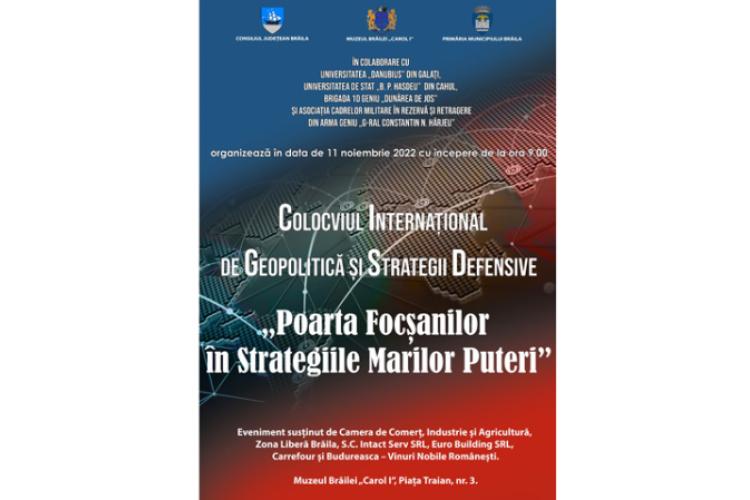 Astfel, potrivit comunicatului instituției, Muzeul Brăilei „Carol I”, Consiliul Județean și Primăria Municipiului Brăila, în colaborare cu Brigada 10 Geniu „Dunărea de Jos” Brăila, Asociația Cadrelor Militare în Rezervă și Retragere din Arma Geniu „General Constantin N. Hârjeu”, Universitatea Danubius Galați și Universitatea de Stat „Bogdan Petriceicu Hașdeu” din Cahul, Republica Moldova, organizează vineri, 11 noiembrie 2022, cu începere de la ora 9.00, la sediul central din Piața Traian nr. 3, Colocviul Internațional de Geopolitică și Strategii Defensive cu tema „Poarta Focșanilor în Strategiile Marilor Puteri”.